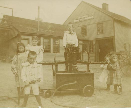 Preston with the hose, assorted Stewart and Fairbanks kids. In the courtyard between the Fairbanks blacksmith shop and the Stewart wheelwright shop.