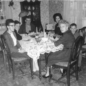 From left, clockwise: Alice Billheimer, and Wally, Dad (William), Sarah, Tim, and Mom (Margaret ) Hilliard, Christmas 1962: photo probably by Dave Billheimer, dining room, 151 State Street, Framingham, MA.